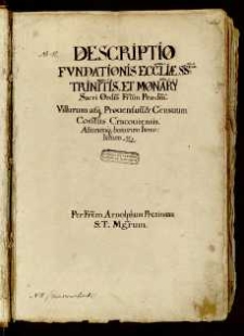 Descriptio fundationis Ecclesiae S[anctissi]mae Trini[ta]tis et Mona[ste]rii Sacri Ordinis Fr[atr]um Praed[icatoru]m Villarum Prouentuu[m], & Censuum Con[ven]tus Cracouiensis. Aliorumq[ue] Bonorum Immobilium &c. Per Fr[atr]em Arnolphum S: T: M[a]g[ist]rum.Descriptio Obligationum Missarum Anniuersariorum et Orationu[m]. Ex Antiquis Scriptu[ri]s. Adnotationib[us]q[ue]. in Annalibus, ex Calendis Pargameneis. Copiis Intercisarum et Recognitionum et ex Authenticis Actis Consiliorum Con[ven]tus Cracoui[ensi]s.Informatio de structura Altaris Maioris. De Organis.Descriptio Gradualium, Antiphonariorum, Psalteriorum, Processionalium, Aliorumq[ue]. Librorum choralium; Inwentarz Zakristyi;